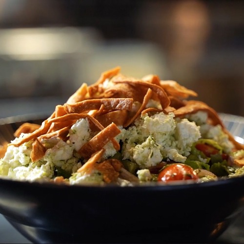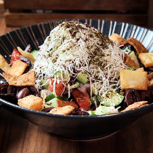 חסה, ירקות טריים, גבינה בולגרית, לחם טורטייה מטוגנת, בצל סגול, זעתר עם סומק, שמן זית.