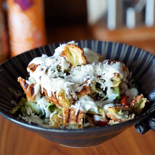 חסה, ירקות טריים, חתיכות שניצל, לחם טורטייה מטוגנת.