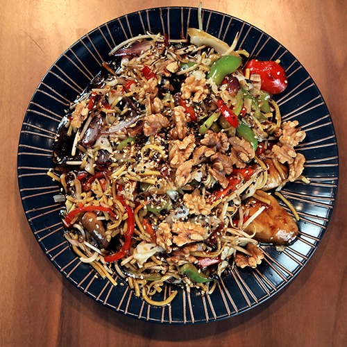 נודלס, גזר, פלפל צבעוני, בצל סגול, כרוב לבן, מוקפצים עם בשר סינטה