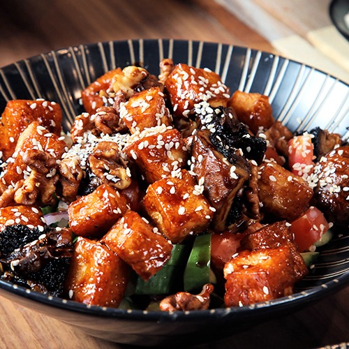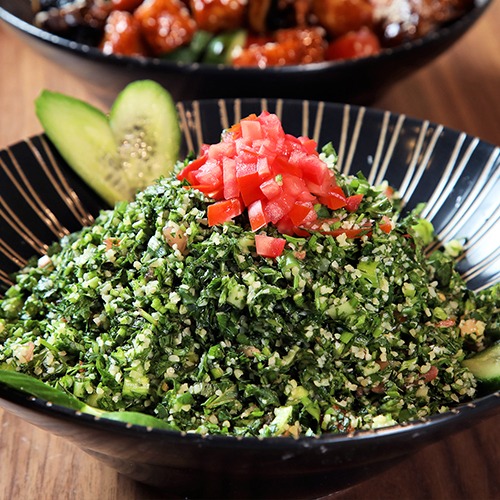 חסה, ירקות טריים (מוגש עם אצבעות חזה עוף בגריל וירקות מוקפצים), טורטייה מטוגנת.